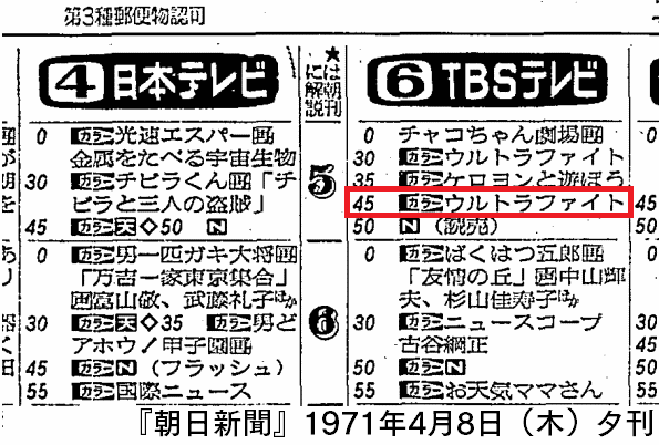「ウルトラファイト」は全国で同時に放送されてはいなかった。別の記事で詳述しているように、現在確認している限り東京のTBSと同時に放送が始まったのは大阪のABC(朝日放送)だけにすぎない。やや遅れて北海道(HBC)・山梨(UTY)・宮城(TBC)でも放送が始まるが、本格的に全国へ広がったのは1971年4月以降のことである。