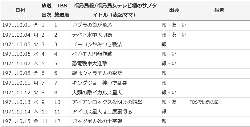というわけで、年末年始とゴールデンウィークに若干の謎を残しながらも、福島テレビにおける放送の全容を解明することができた。なお、謎のリピート放送の割を食って、「ペテロ月世界でパンク」「プロスパイプロテ星人」「怪獣無常」「見た!アボラスの恐い顔」「さすが!バルタン忍法」のうち4話は未放送に終わったと考えられる。